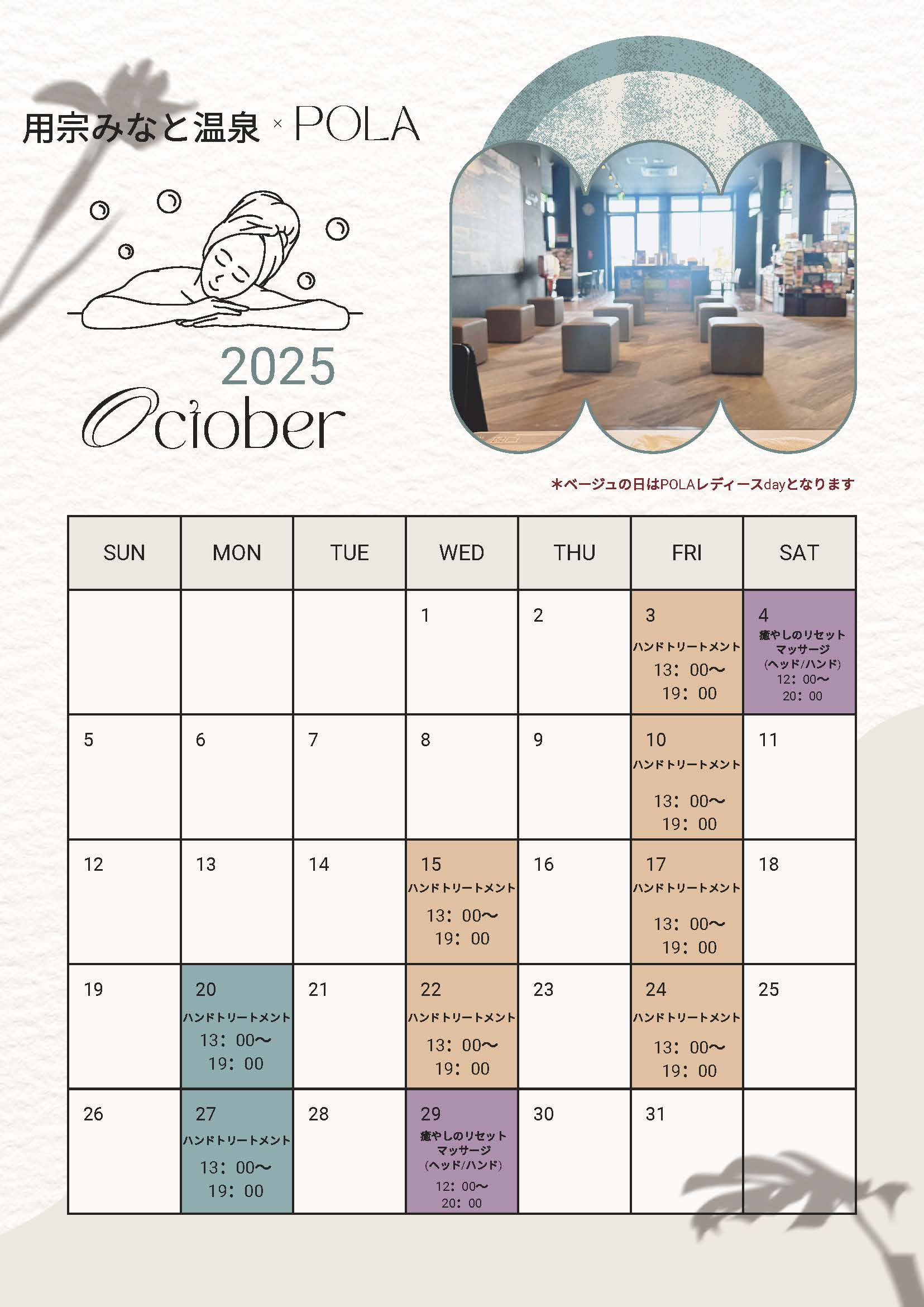 尚、9月と同様に「無料ハンドトリートメント」の一部日程にて、レディースdayが導入されます。