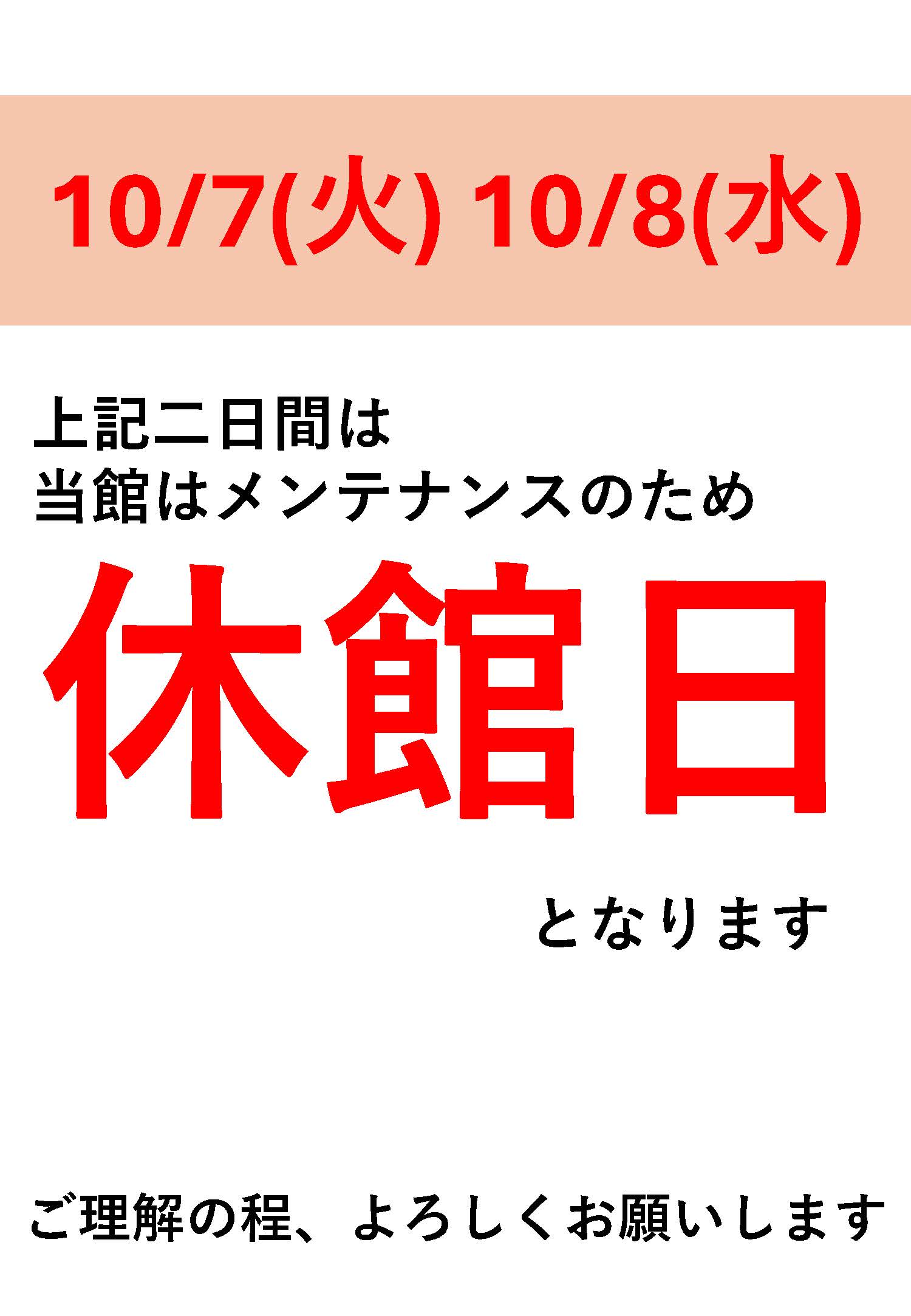 【2025年10月7日(火)、10月8日(水)】臨時休館のお知らせ